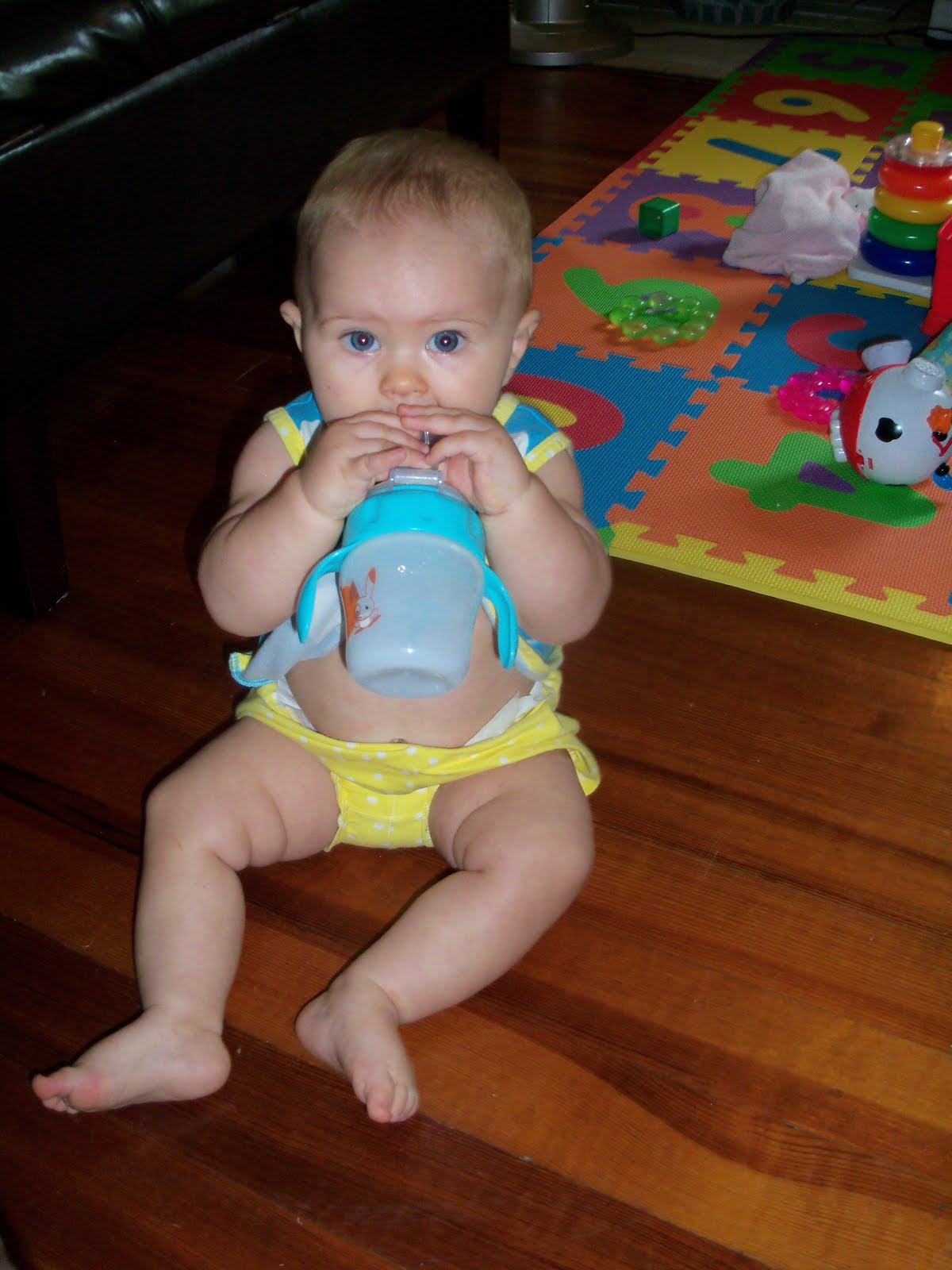 She is crawling (it's more of a scoot, but it works) everywhere. She never sits still, which explains the lack of any cute, posed pictures.